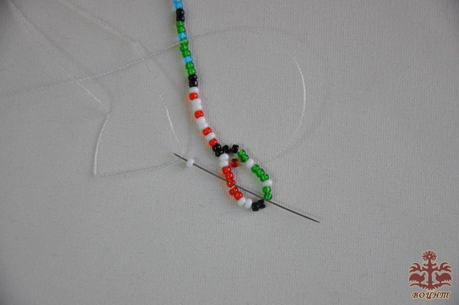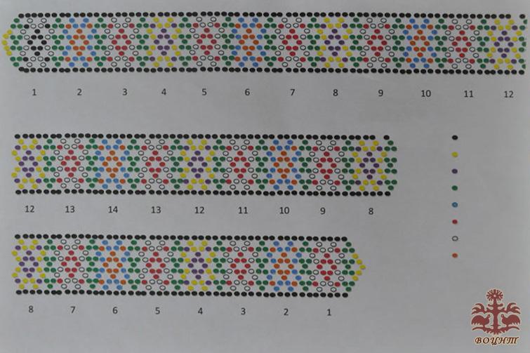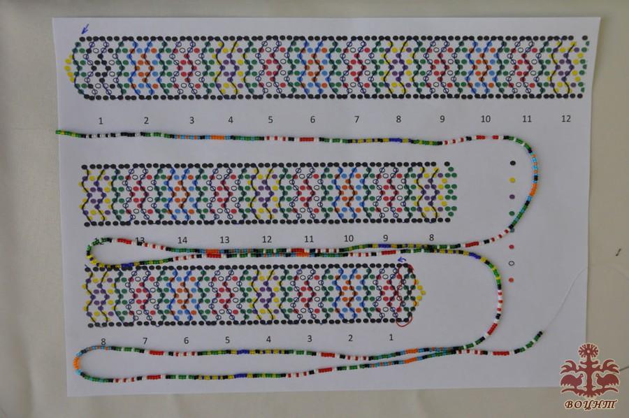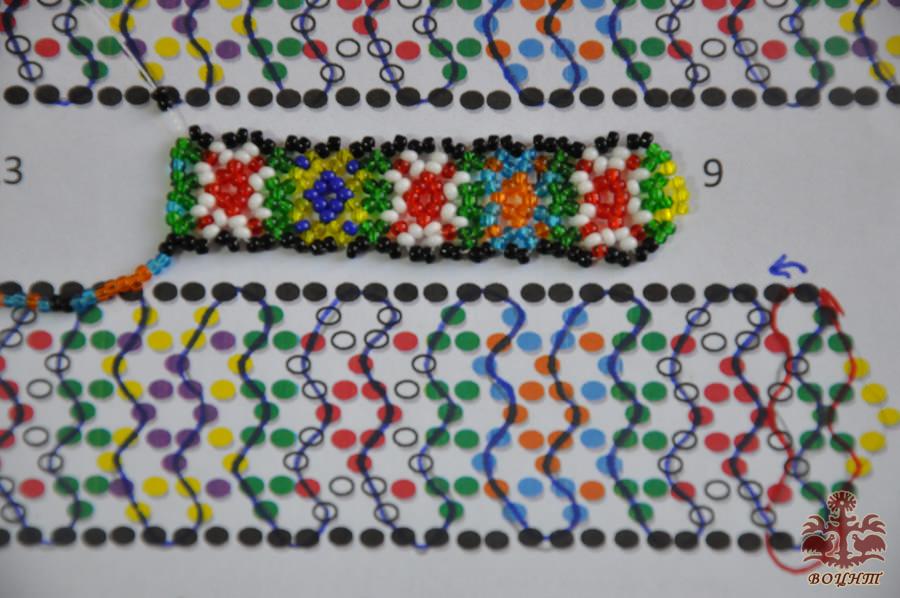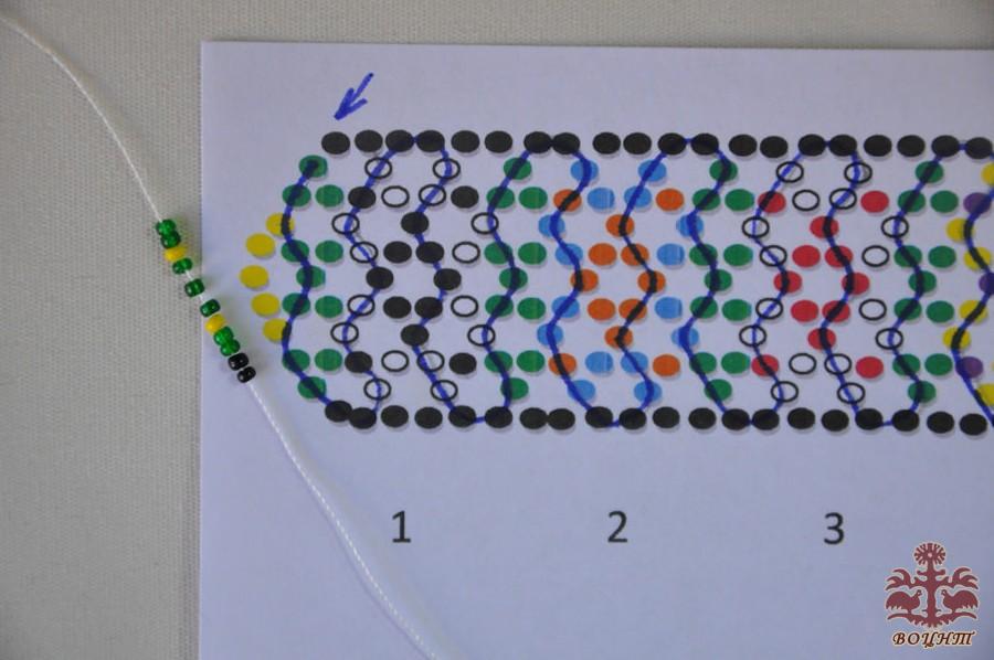 Зазвичай, подільська зґарда робиться не так, як плетуться бісерні прикраси Західної України. Секрет її створення в тому, що бісеринки за схемою набираються на одну нитку (нитка на схемі показана синім кольором) (фото 4,5).