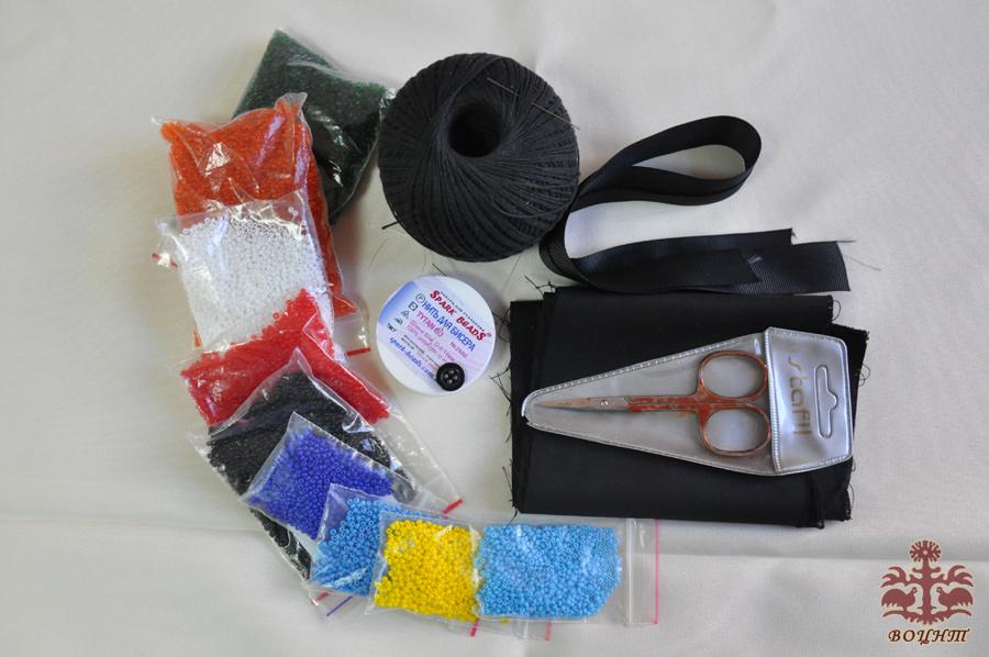 Для цього нам знадобляться (фото 1): бісер восьми кольорів, ниточка для плетення з бісера «Титан 60», тоненька голочка для бісера, тарілочка, чорна нитка, чорна стрічка або тканина, ножиці, ґудзик.