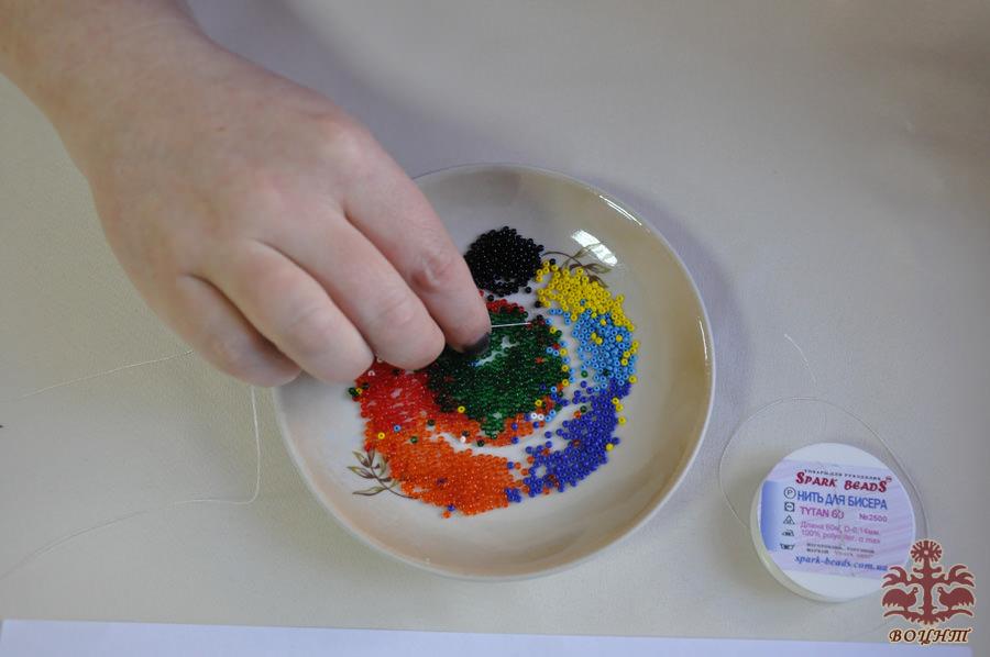 Починаємо працювати. Висипаємо різні кольори бісеру у невеличку тарілочку – так зручніше брати бісер (фото 3). Розкручуємо нитку для бісера, але не обрізаємо її.