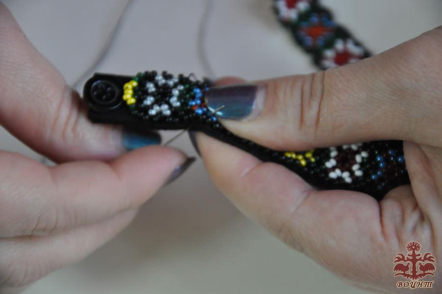 Вирізали прямокутник, загнули його і зшили його так, щоб він виступав на 1 мм за край зґарди. З однієї сторони пришиваємо маленький ґудзичок. Біля нього починаємо пришивати бісерну зґарду на тканину (фот 14). Після цього з іншої сторони робимо петлю з ниток для ґудзика (фото 15).