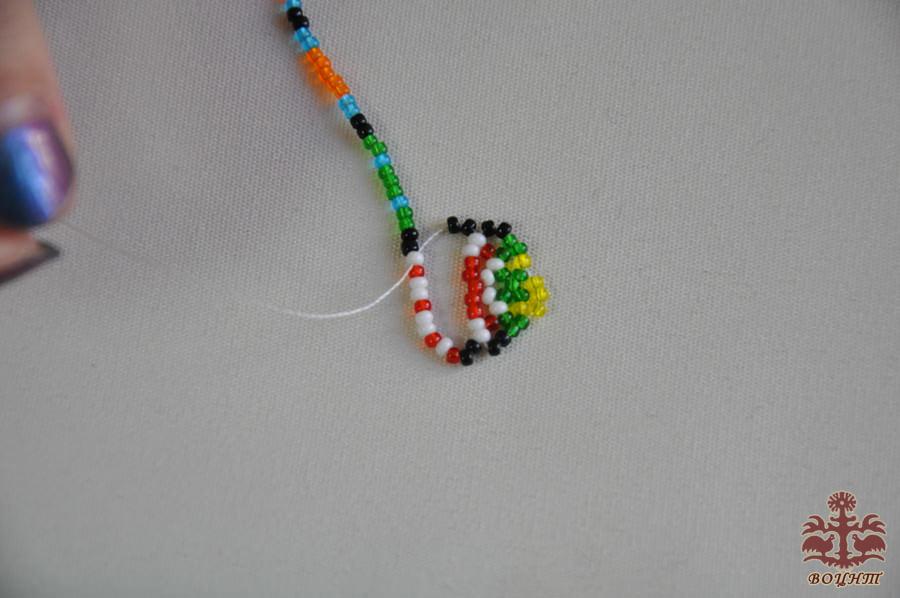 Щоб зʼєднати частини нитки між собою – додаємо по схемі потрібні бісеринки для звʼязки (фото 9,10,11).
